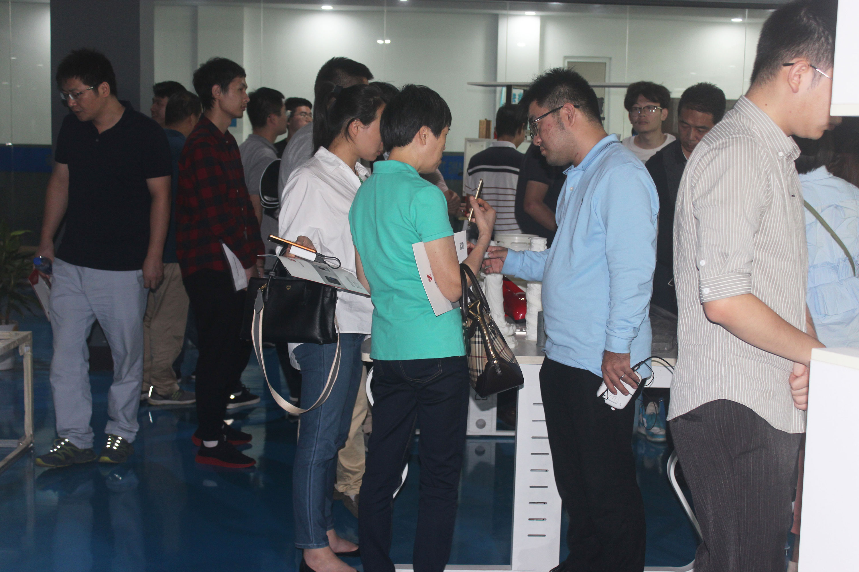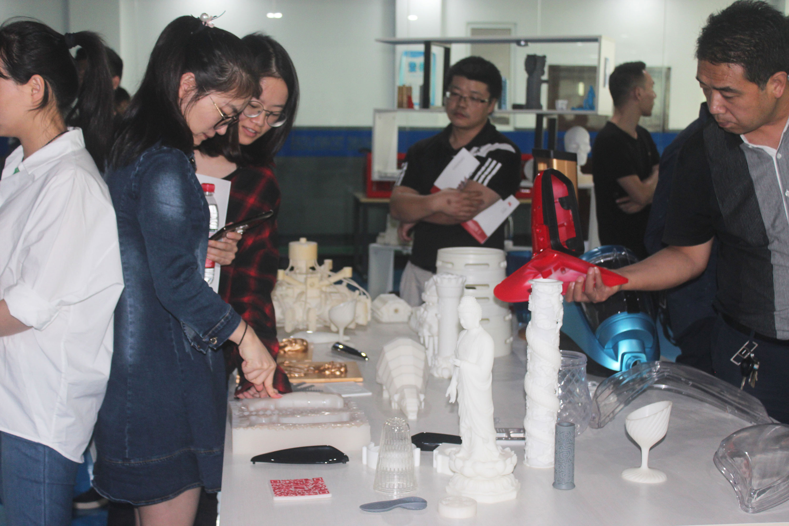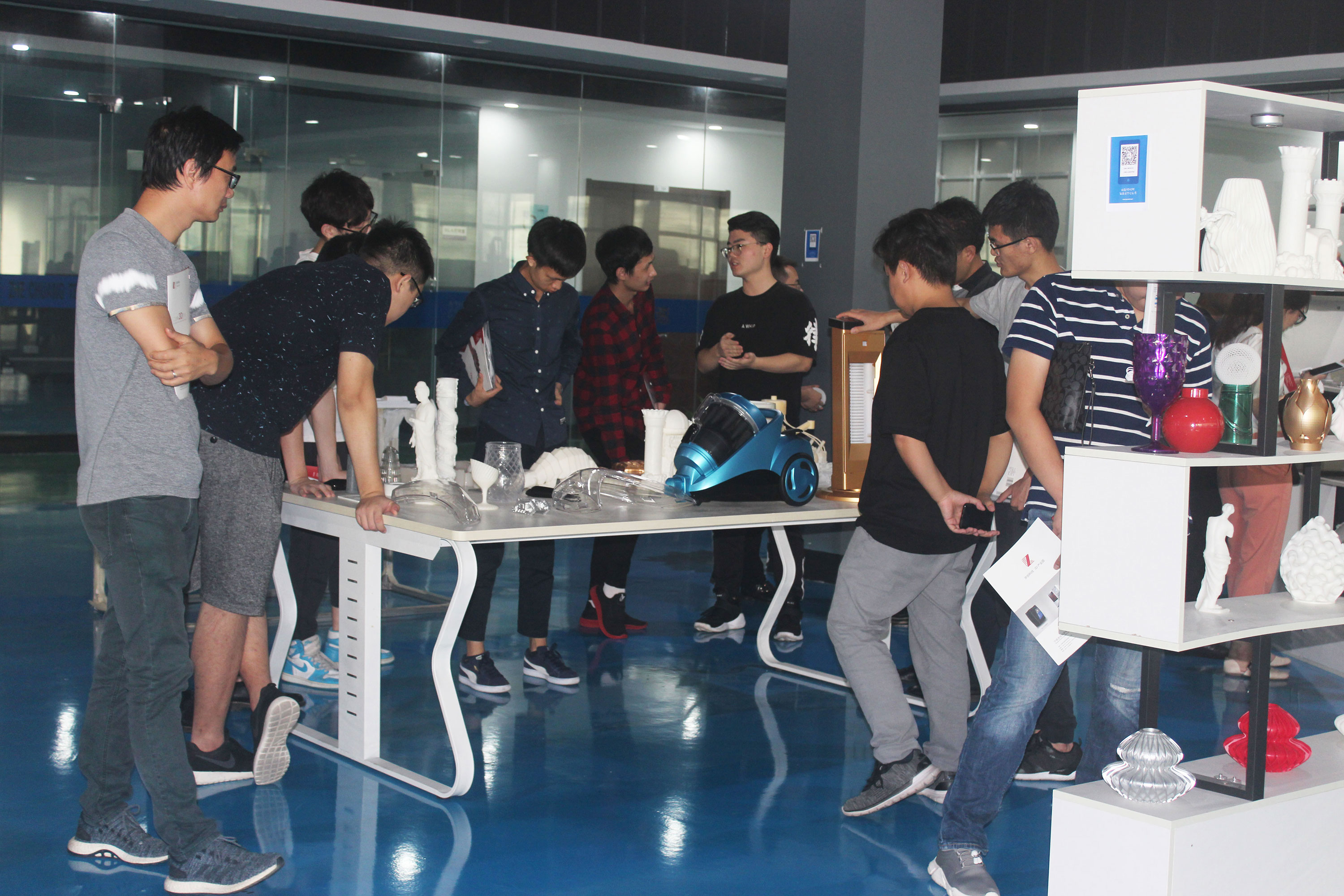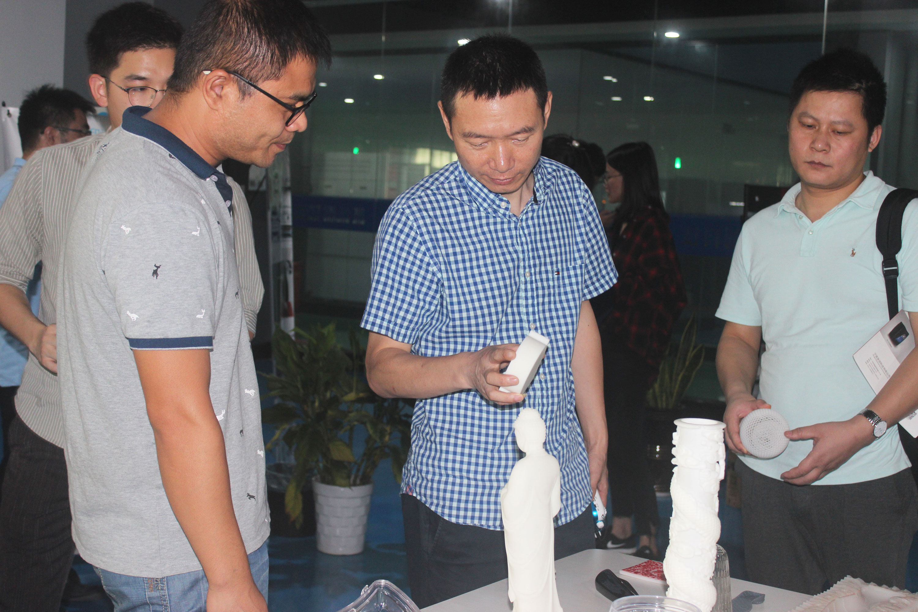 在陶董事長等浙創科技領導的陪同下,來訪嘉賓一行參觀了3D打印車間,詳細了解了SLA工業級3D打印機打印流程,觀察SLA成型方式。在3D打印樣品間,陶董事長和陶總經理向來訪嘉賓展示了3D打印的各種模型,來訪嘉賓對優質的家電和汽車配件模型表現出了濃厚的興趣,并就模型生成的整個過程向浙創科技工作人員進行了詳細的詢問。