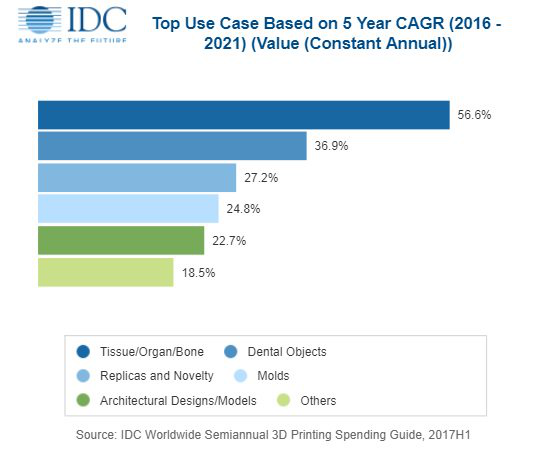 IDC還確定哪些制造行業(yè)在3D打印技術(shù)上花費(fèi)最多。3D打印將由三大產(chǎn)業(yè)主導(dǎo):汽車,航空航天和醫(yī)學(xué)支出最為顯著,占IDC預(yù)測(cè)期間全球支出的一半以上。行業(yè)分析離散制造,如汽車,飛機(jī)和玩具等不同的項(xiàng)目,預(yù)計(jì)將出現(xiàn)在支出之上。其次,3D打印在醫(yī)療保健方面,預(yù)計(jì)2018年的總支出將近13億美元。醫(yī)療保健部門將越來越多地轉(zhuǎn)向3D打印以制造手術(shù)指南,矯形裝置,植入物等。預(yù)計(jì)醫(yī)療保健行業(yè)在五年預(yù)測(cè)期間的復(fù)合年增長(zhǎng)率將達(dá)到35.4%。